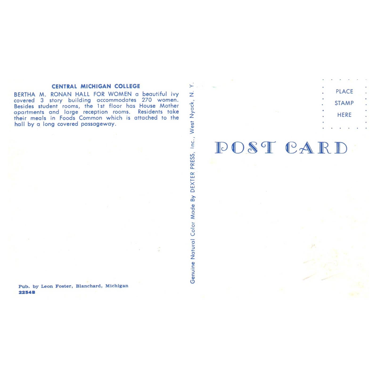 Vintage Postcard - Central Michigan College Bertha M. Ronan Hall For Women TJ7-1
