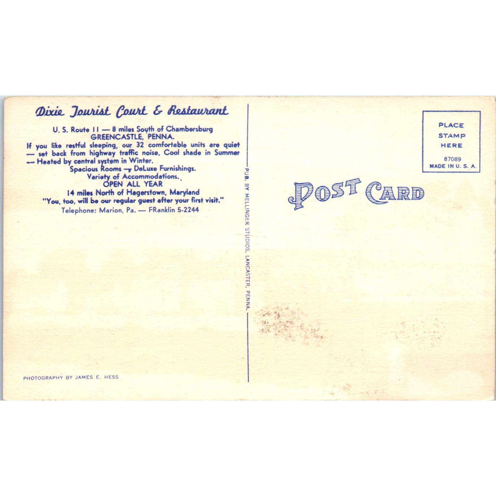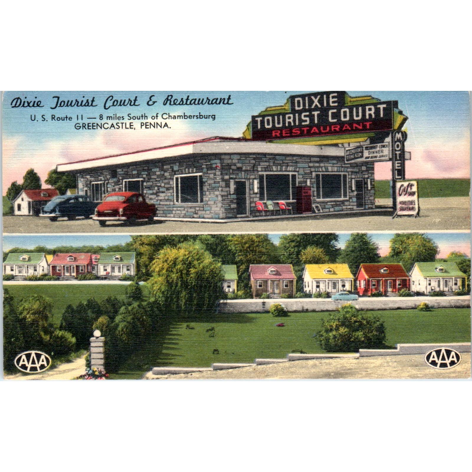 Vintage Postcard Dixie Tourist Court & Restaurant Greencastle PA TD9-P1