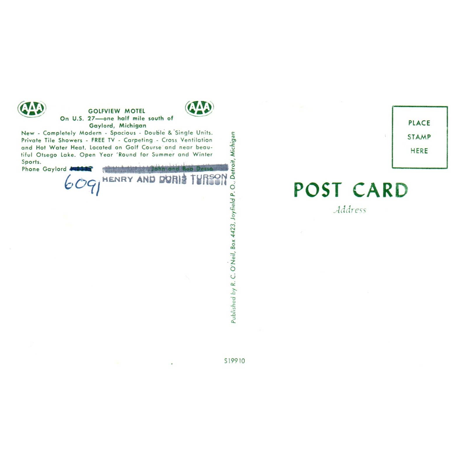 Vintage Postcard - Golfview Hotel Gaylord Michigan Henry & Doris Turson AD9