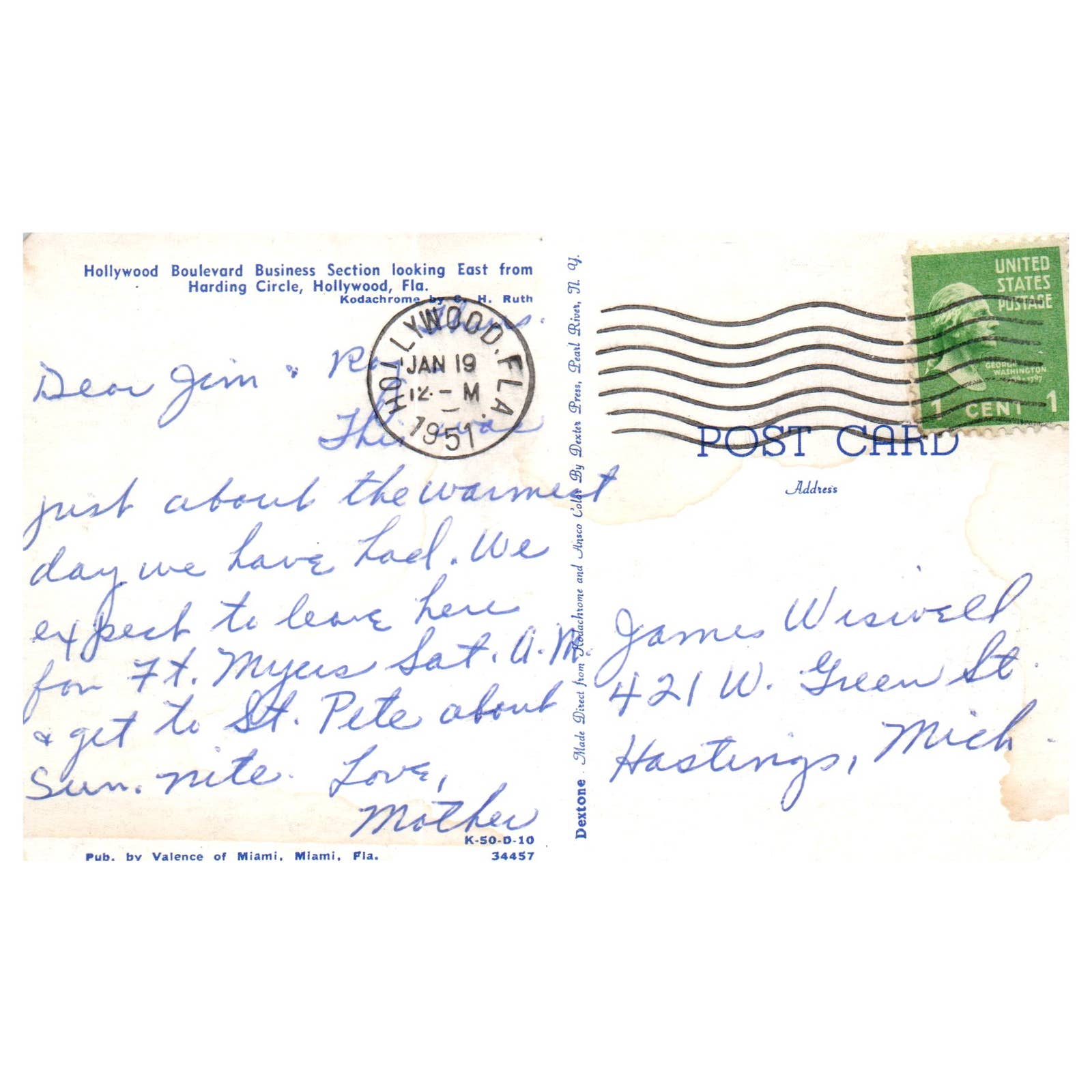 Vintage Postcard - Hollywood Blvd Looking East From Harding Circle FL 1951 AD9