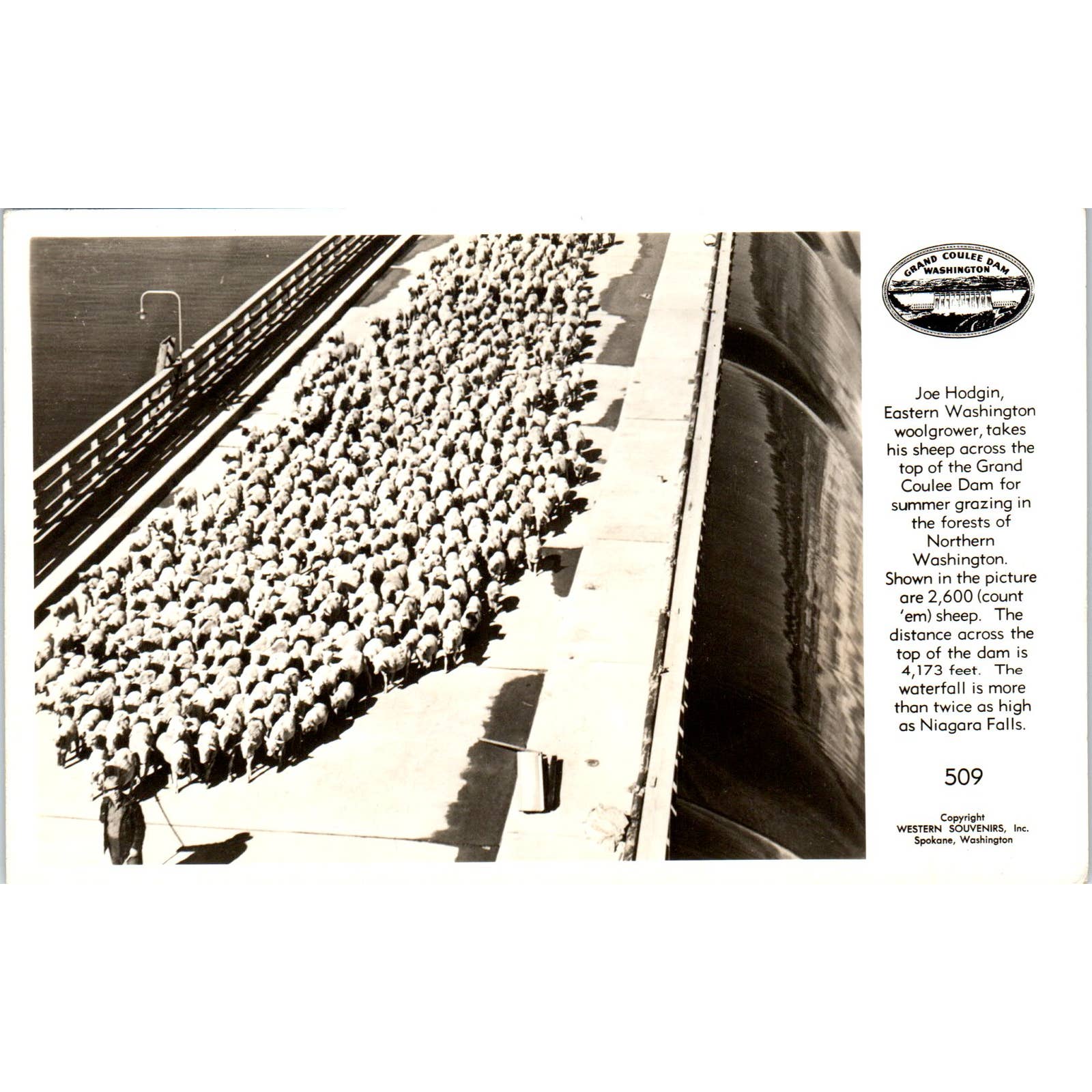 Vintage Postcard Joe Hodgin Woolgrower Takes Sheep Across Grand Coulee Dam Washington TD9-W2