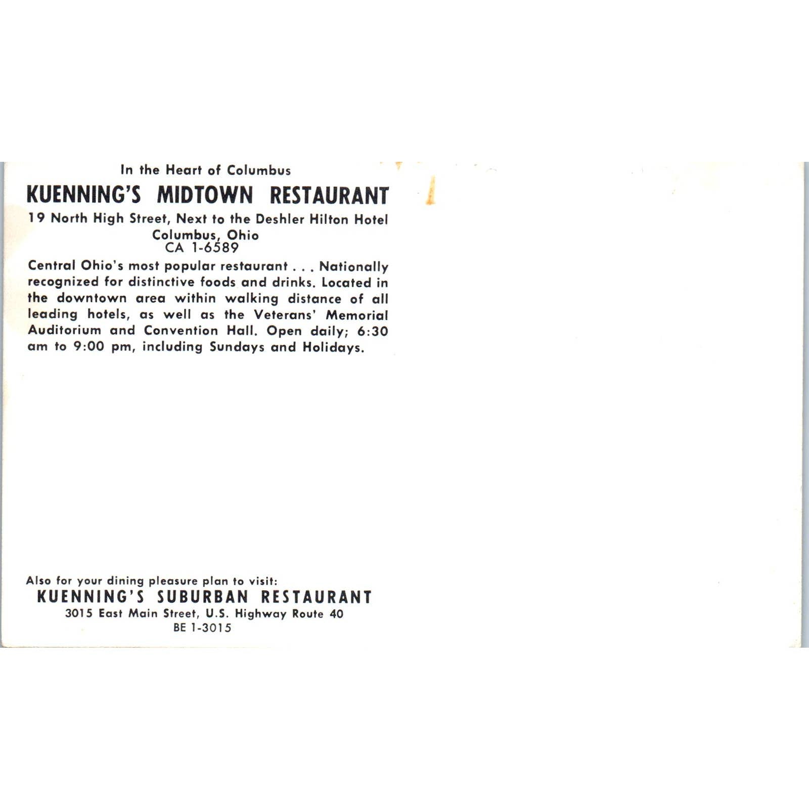 Vintage Postcard Kuenning's Midtown Restaurant Interior View Columbus Ohio TD9