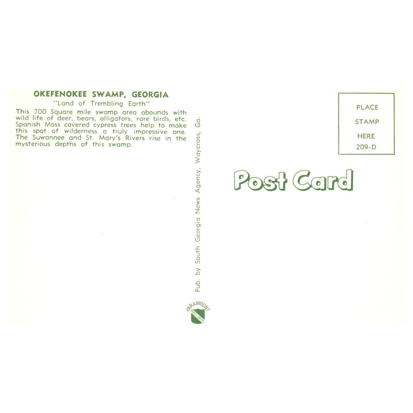 Vintage Postcard - Okefenokee Swamp Georgia AD9