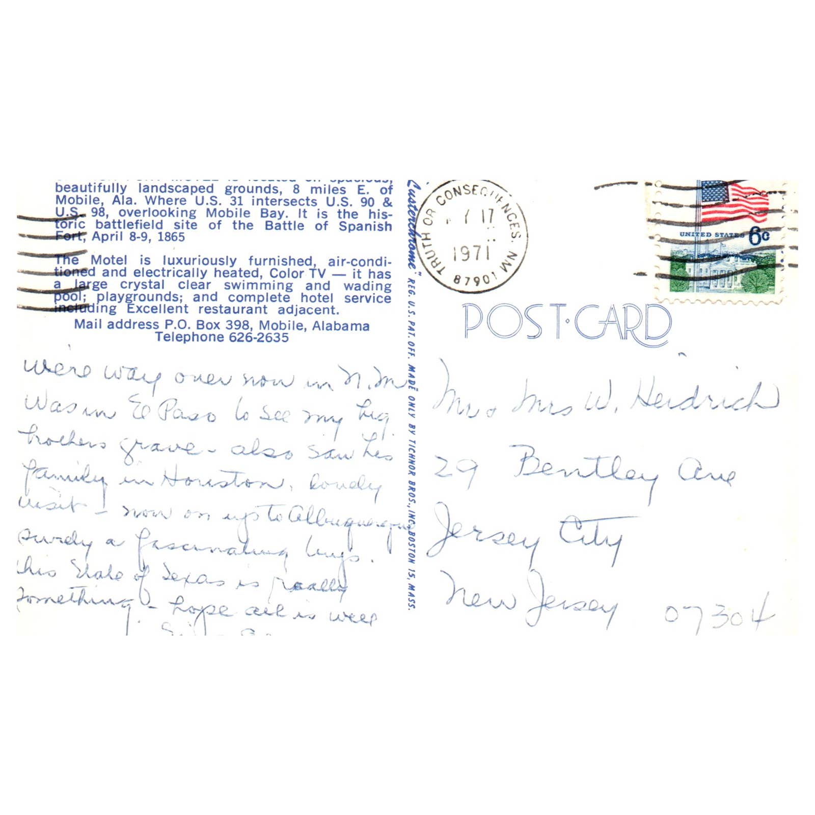 Vintage Postcard - Spanish Fort Motel Mobile Alabama 1971 TJ7-1