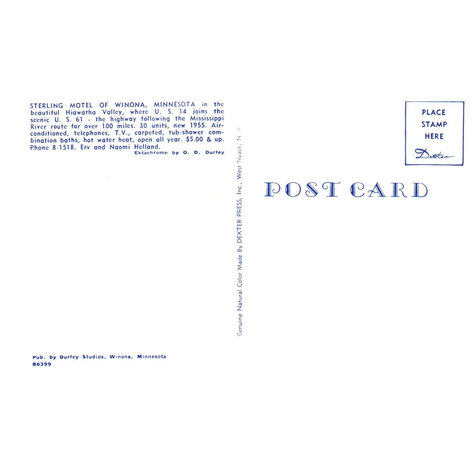 Vintage Postcard - Sterling Motel of Winona Minnesota Erv & Naomi Helland AD9