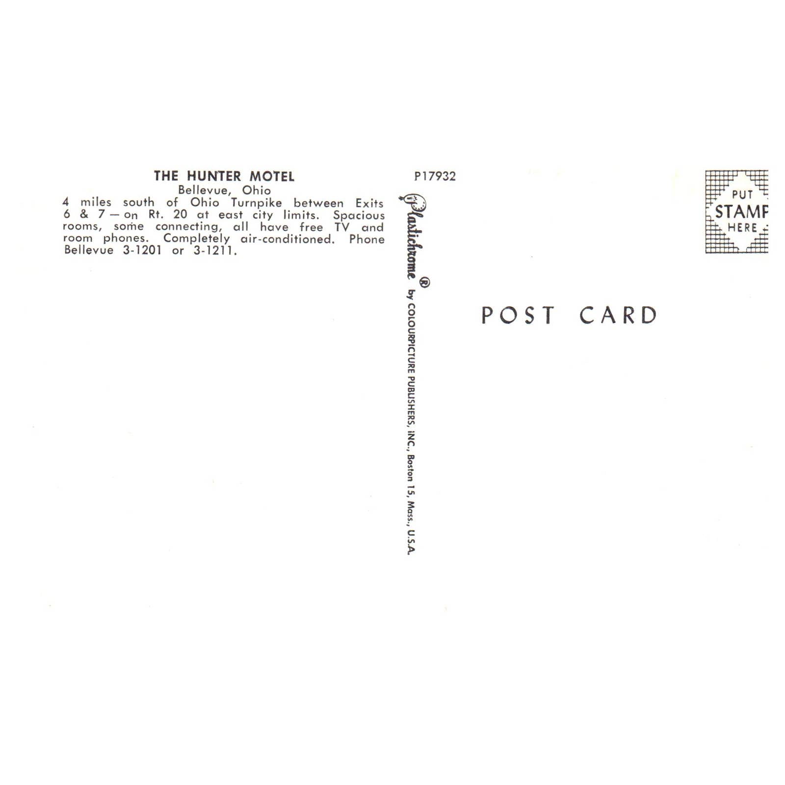 Vintage Postcard - The Hunter Motel Bellevue Ohio AD9