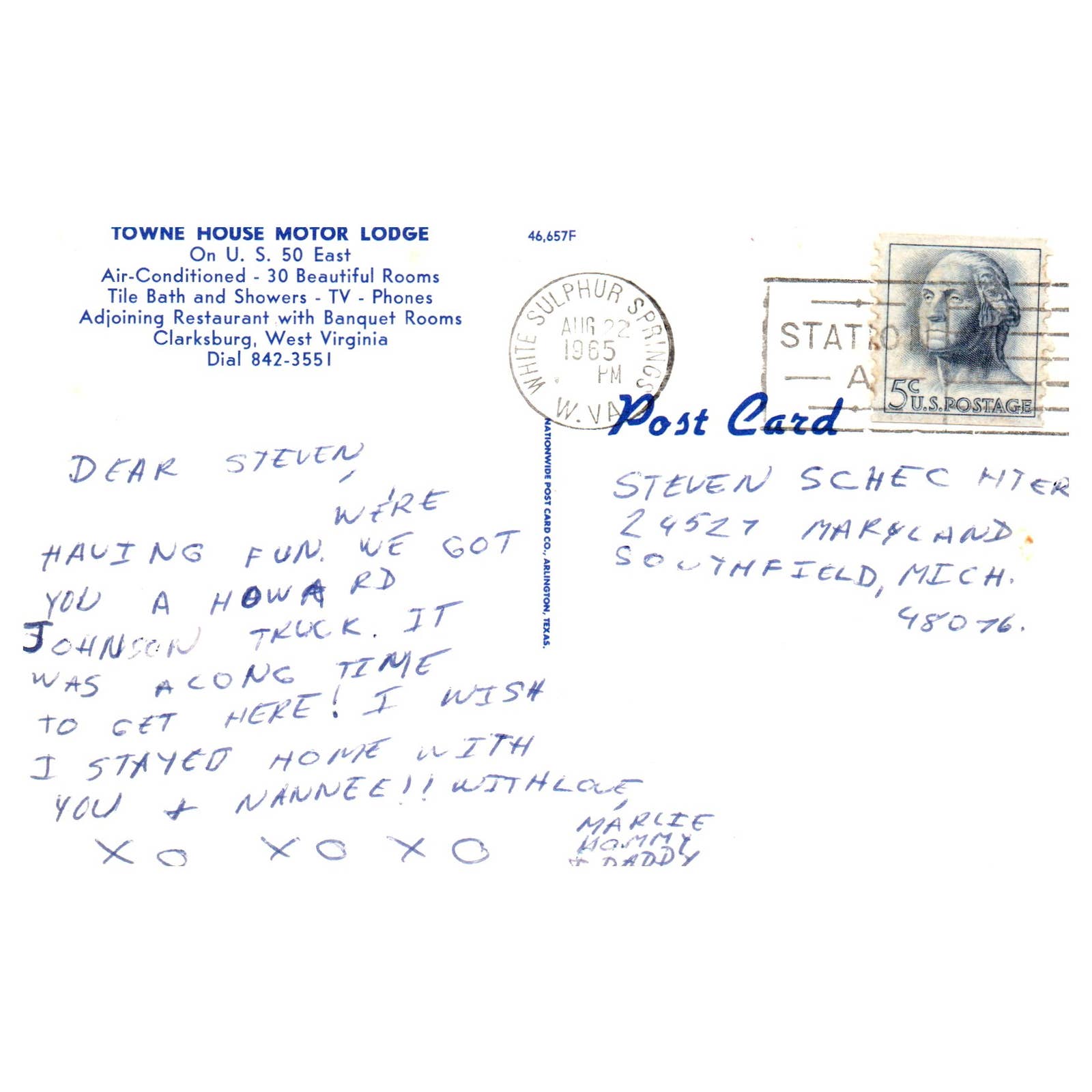 Vintage Postcard - Town House Motor Lodge Clarksburg West Virginia AD9