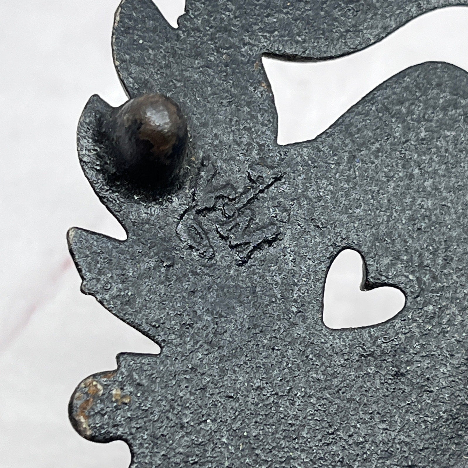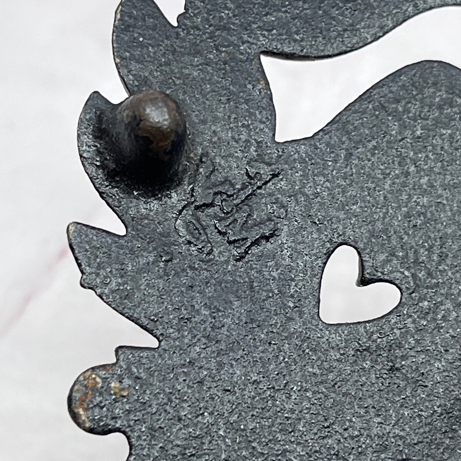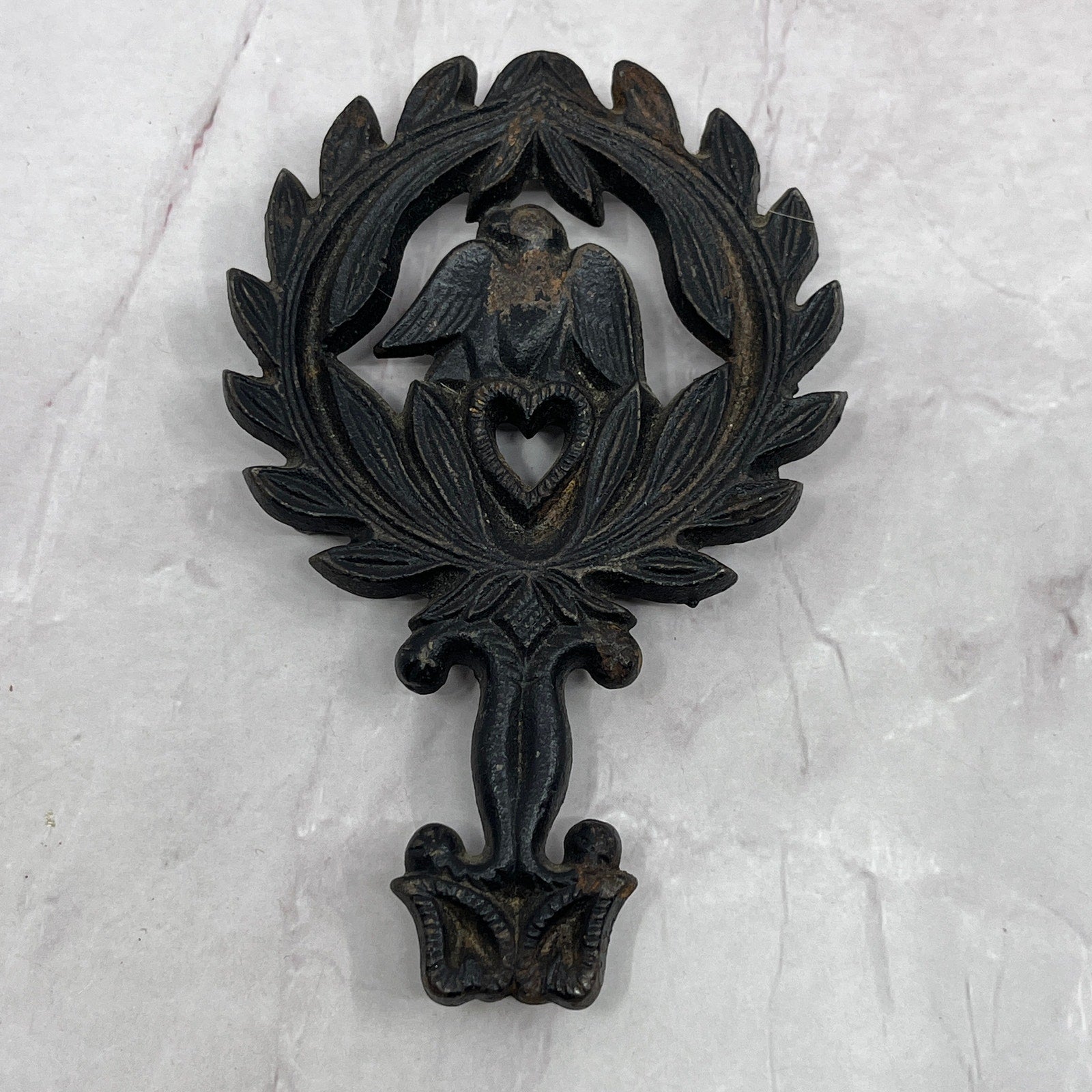 Vintage Small Black Cast Iron Trivet American Bald Eagle Heart Laurel Leaves 4.25" SC1