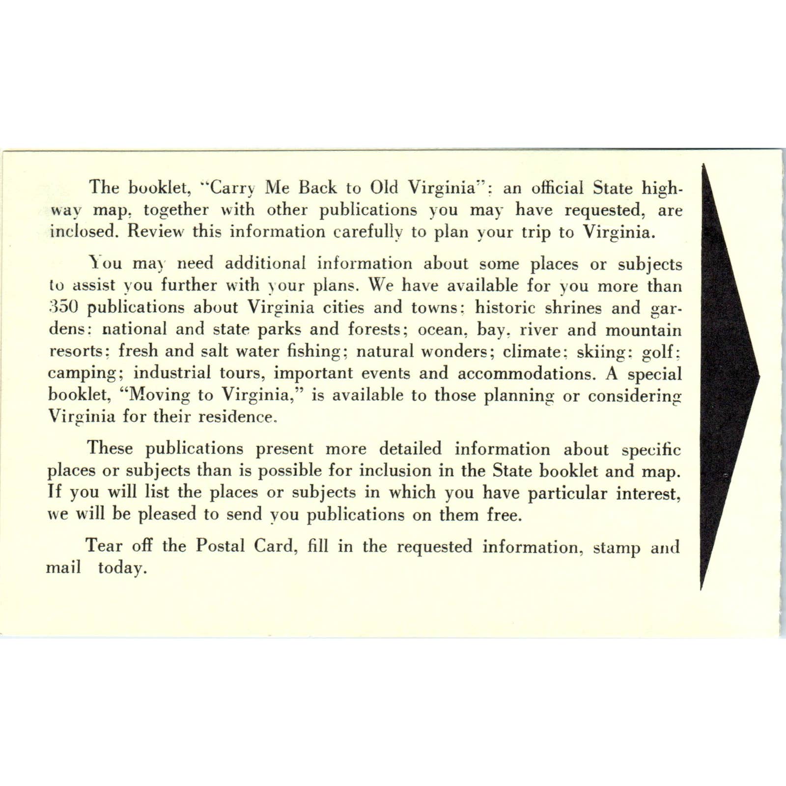 Virginia State Travel Service Travel Planning Assistance Original Postcard TJ9-P2
