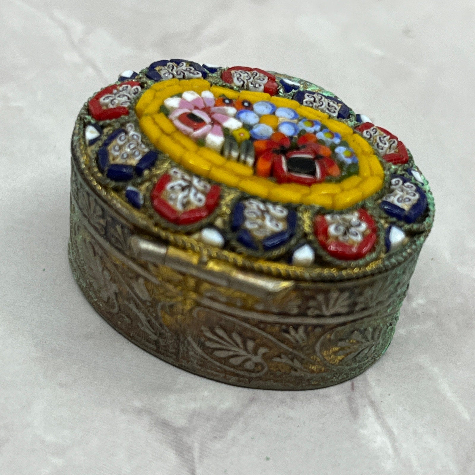 Vintage Italian Murano Glass Micro Mosaic Filigree Gold Tone Pill Box Organizer SC1
