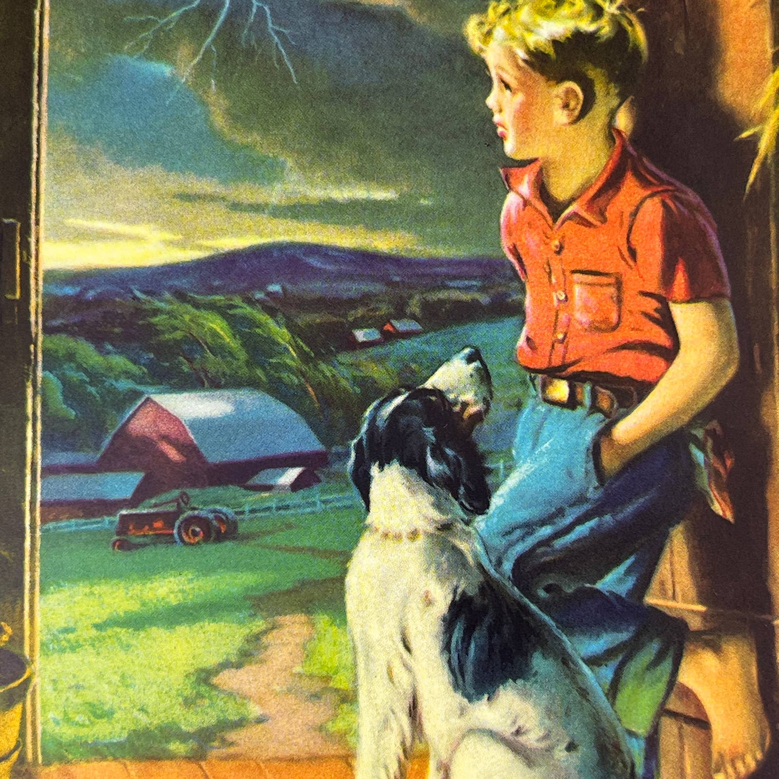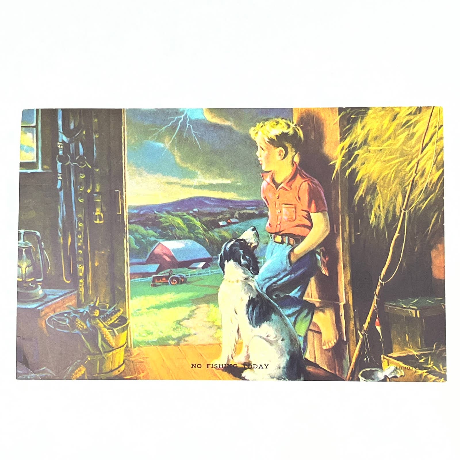 VTG Kitschy Litho Print No Fishing Today Boy in Barn Dog Storm by Harold Anderson AC3