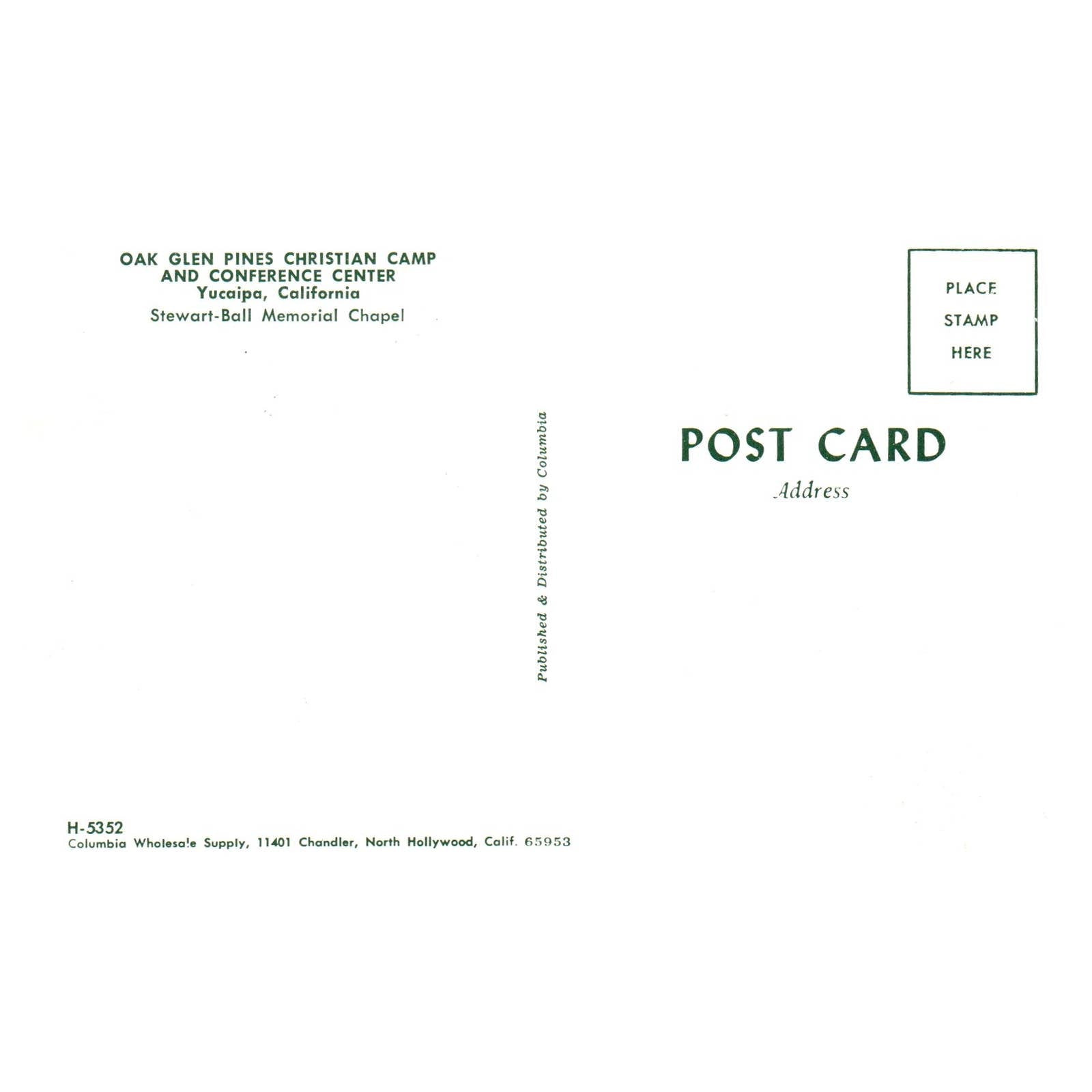 Vtg Postcard - Oak Glen Pines Christian Camp Yucaipa CA Stewart-Ball Chapel AD9