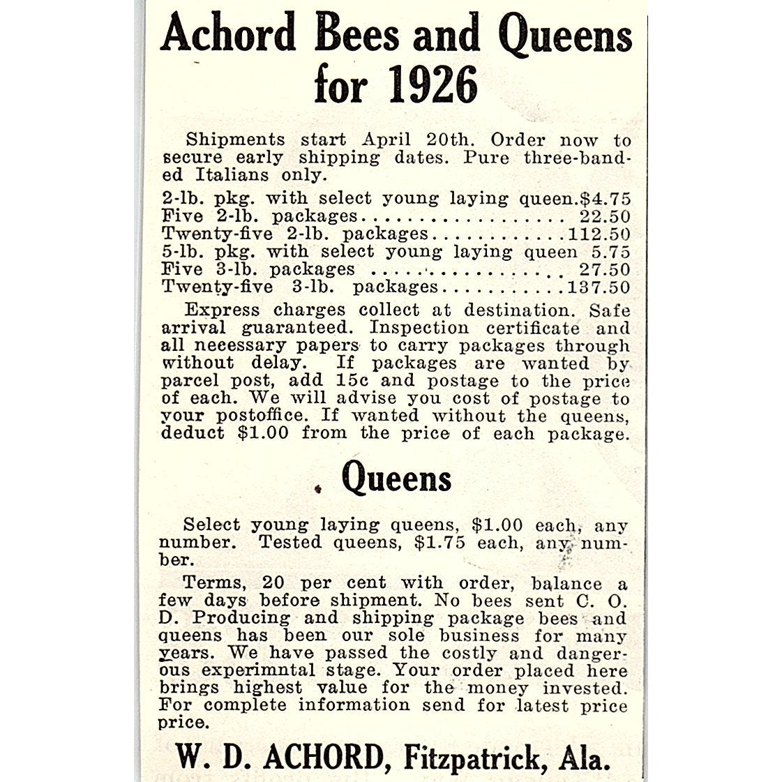 W.D. Achord Bees and Queens Fitzpatrick Alabama 1926 Ad AG3-M8