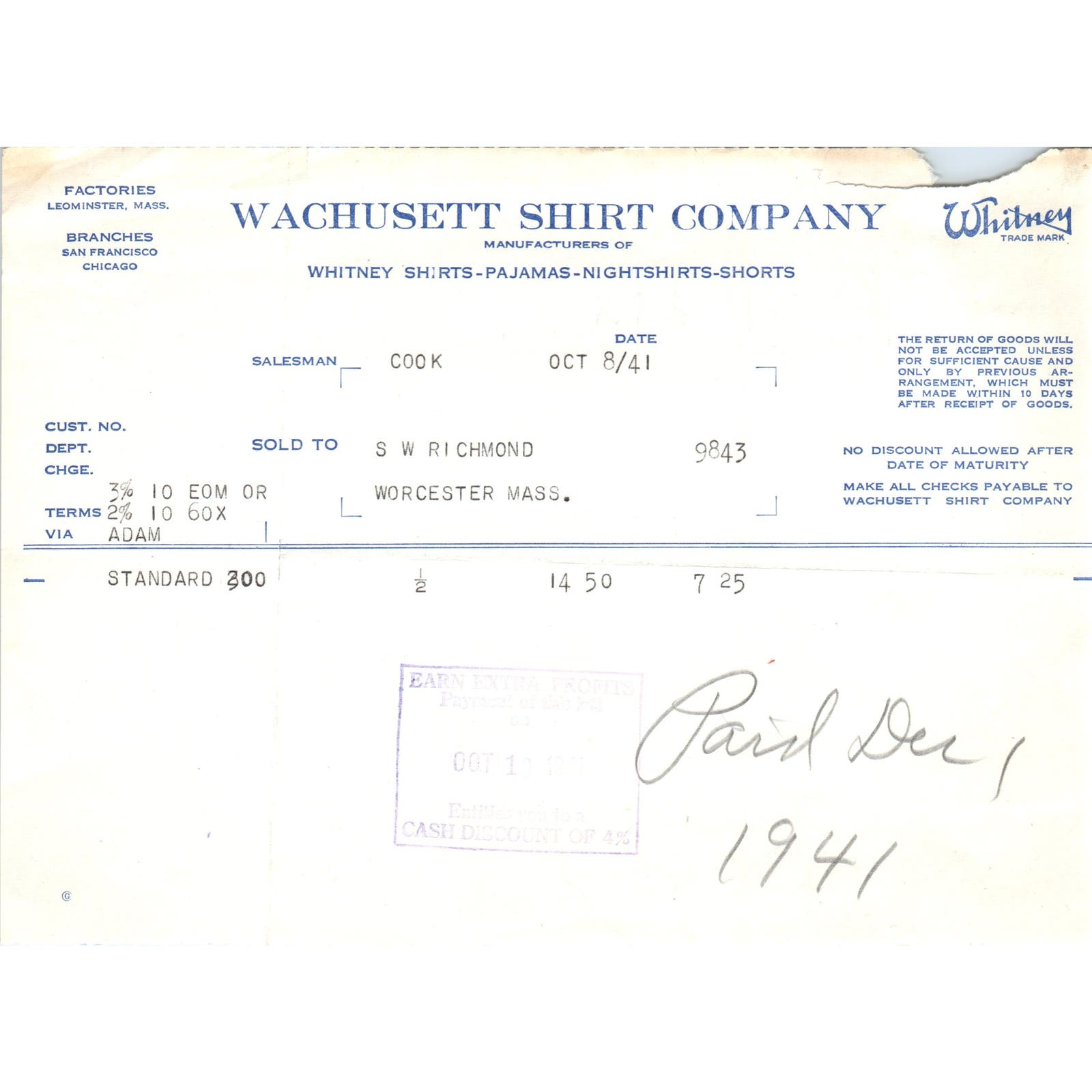 Wachusett Shirt Co Whitney Shirts 1941 Original Billhead Letterhead Receipt D8