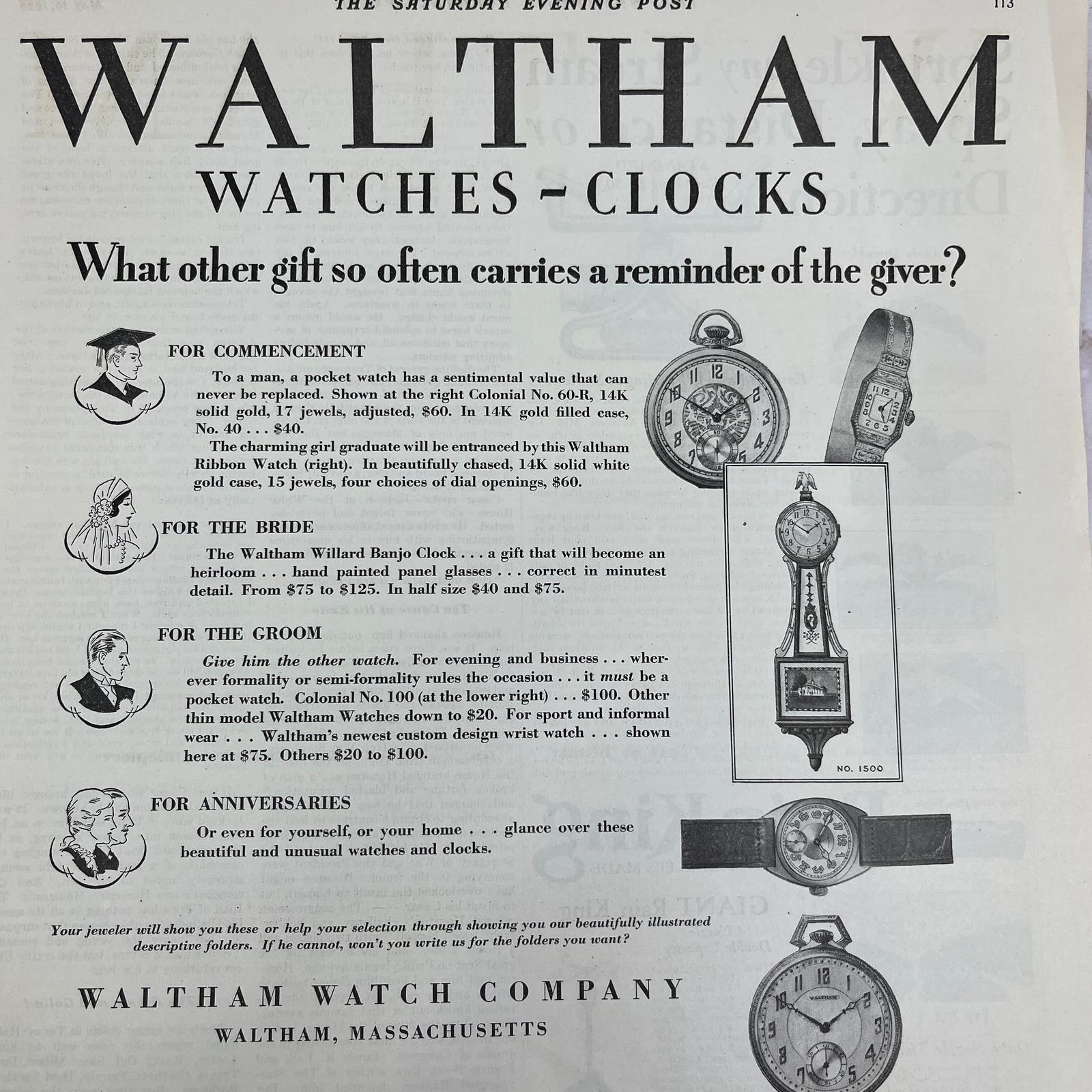 Waltham Watches-Clocks MA 1928 Original Magazine Advertisement FL6-8