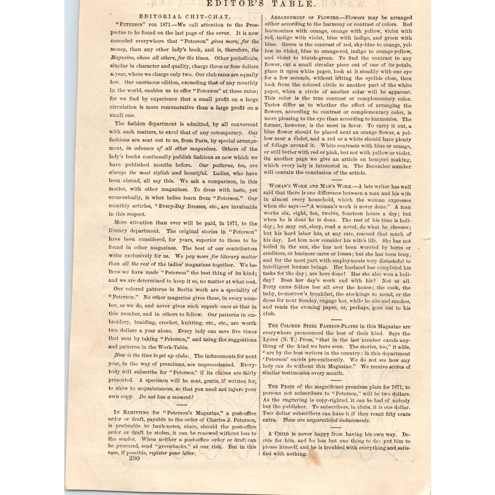 This measures roughly 5x8. Pulled from a 1878 Issue of Peterson's Magazine. See pics for condition. Measurements are approximate.