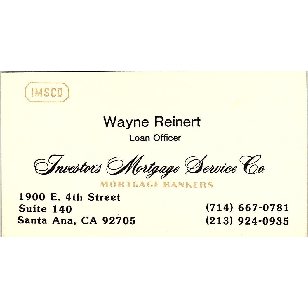Wayne Reinert Investor's Mortgage Service Co Santa Ana CA Vintage Business Card SD9-B4