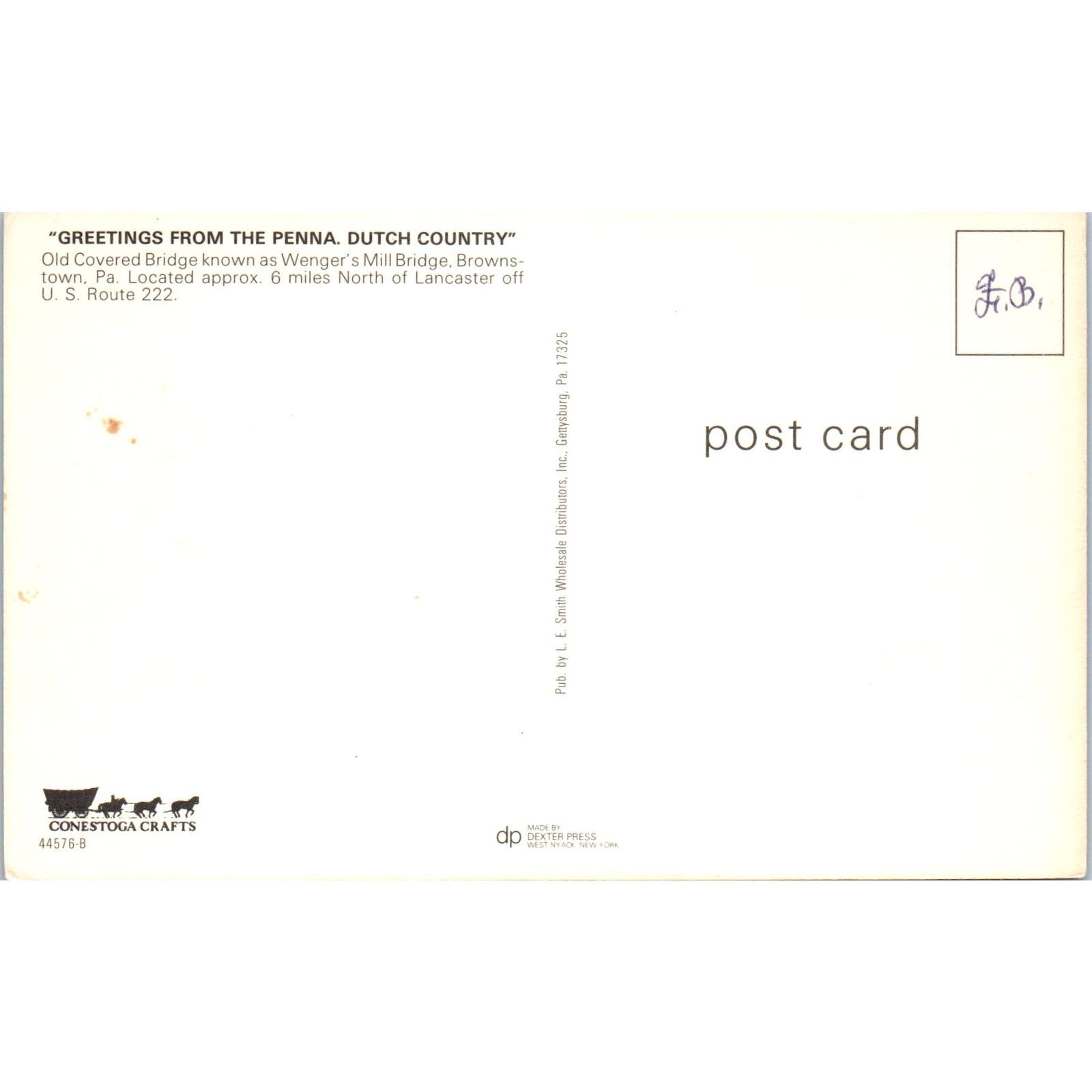 Wenger's Mill Bridge Brownstown PA Covered Bridge Postcard PB13