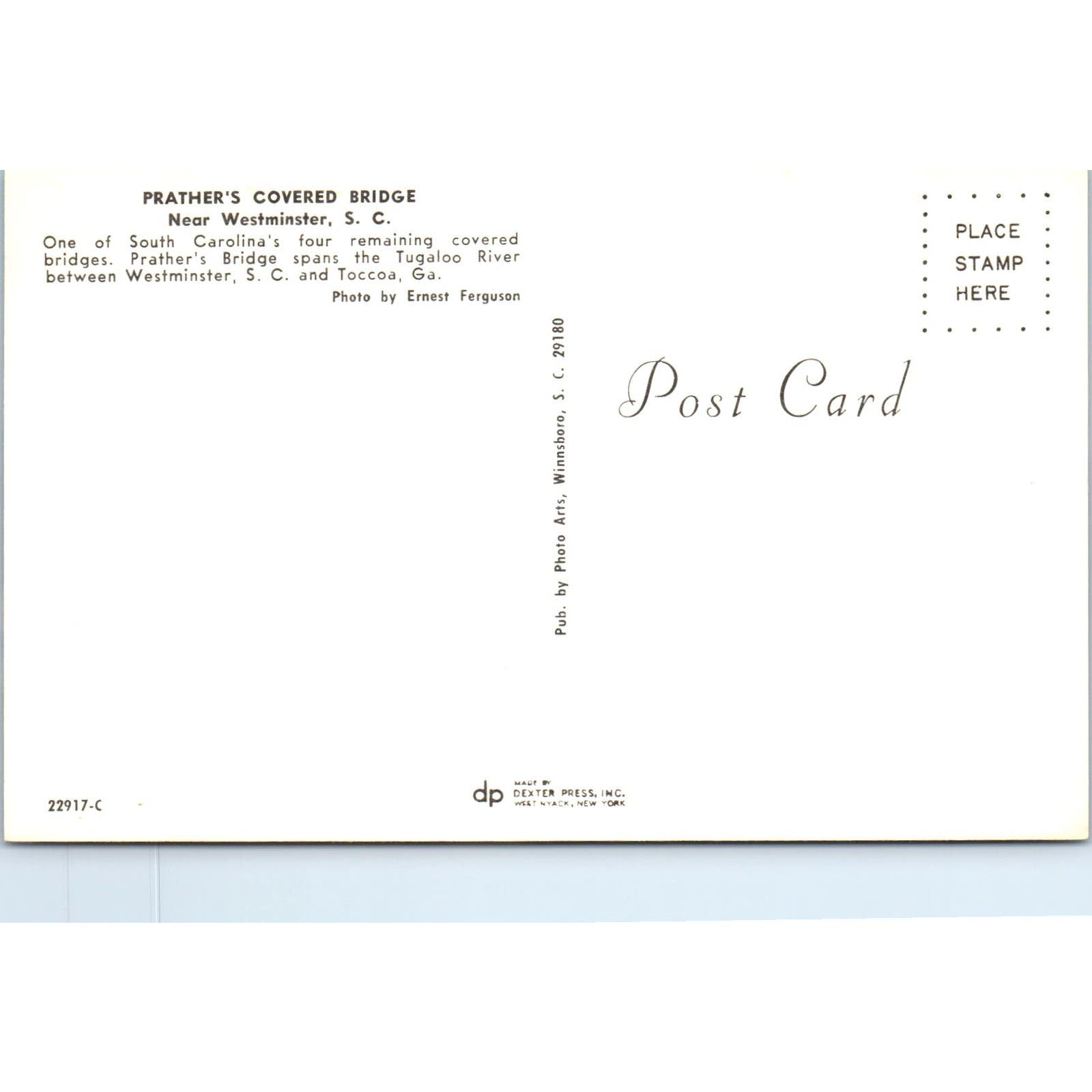 Westminster S.C. Tugaloo river Prather's Covered Bridge Postcard PB10