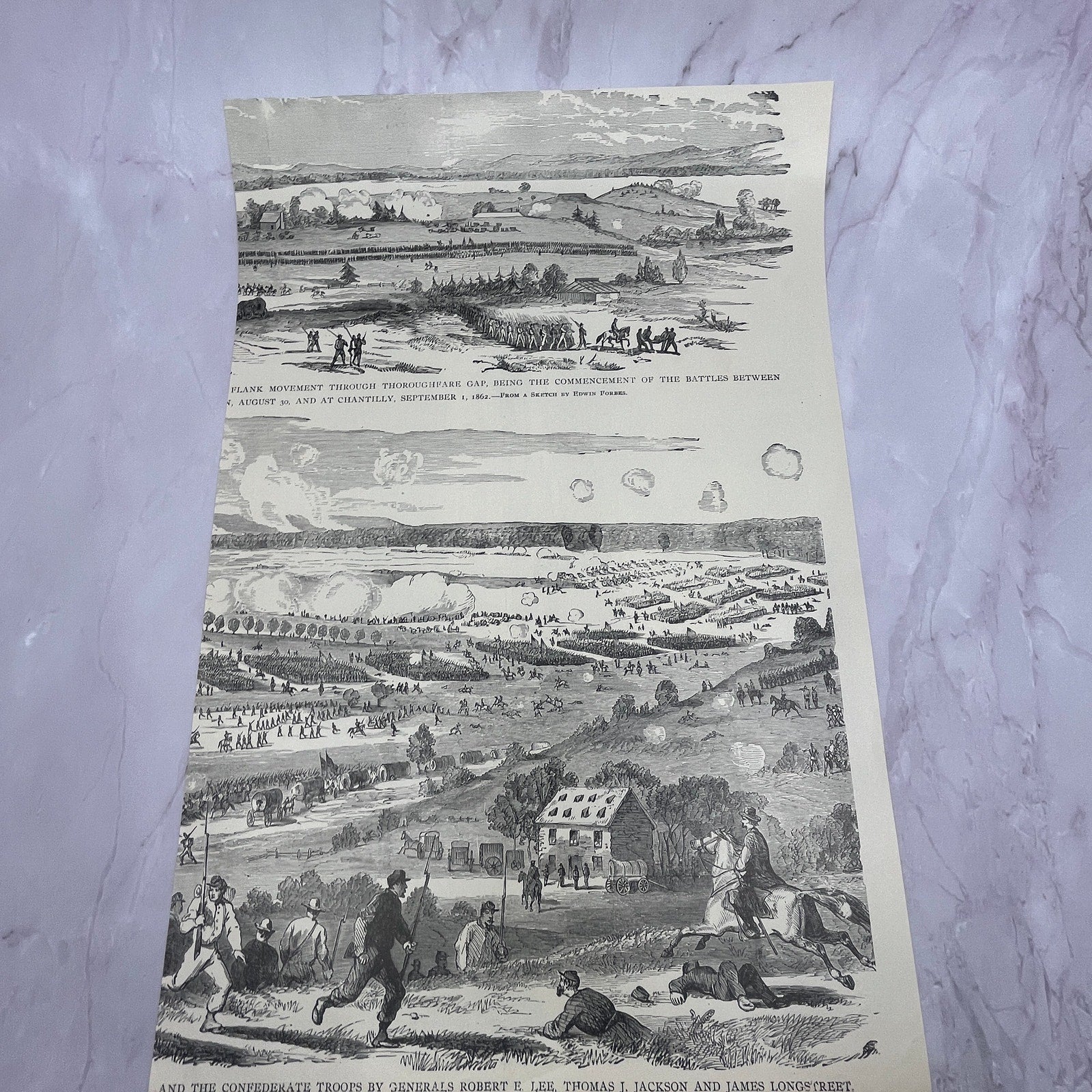 Double sided. Measures Approximately 9.5x14.5". Original engraving from 1890s Book - The Civil War in the United States. Rough around the edges and has regular wear and tear you would expect from a piece this age. See pics for condition.