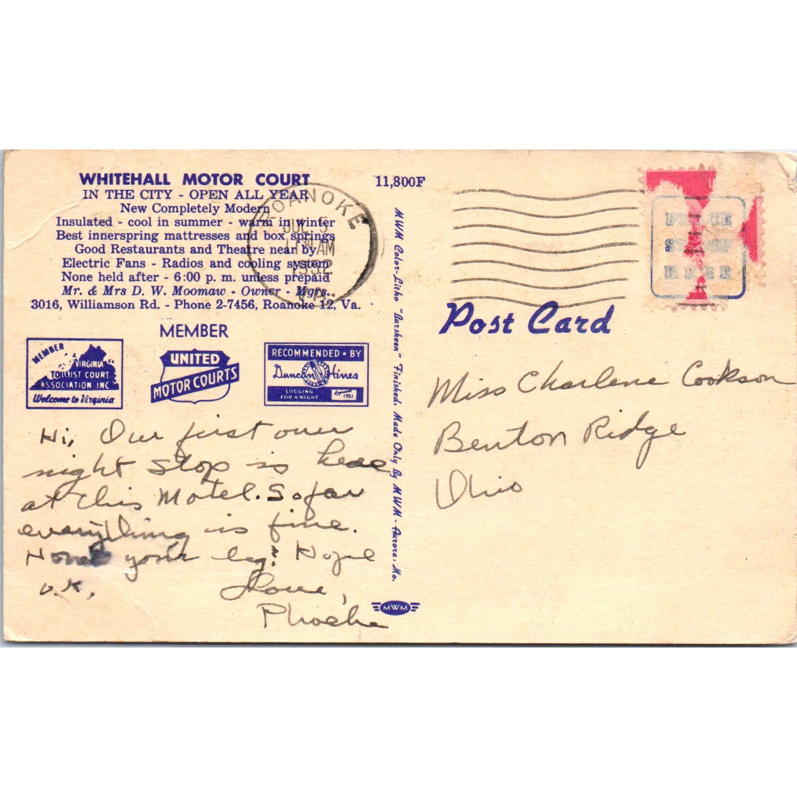 Whitehall Motor Court Roanoke VA D.W. Moomaw 1952 - Original Postcard TJ7-RP2