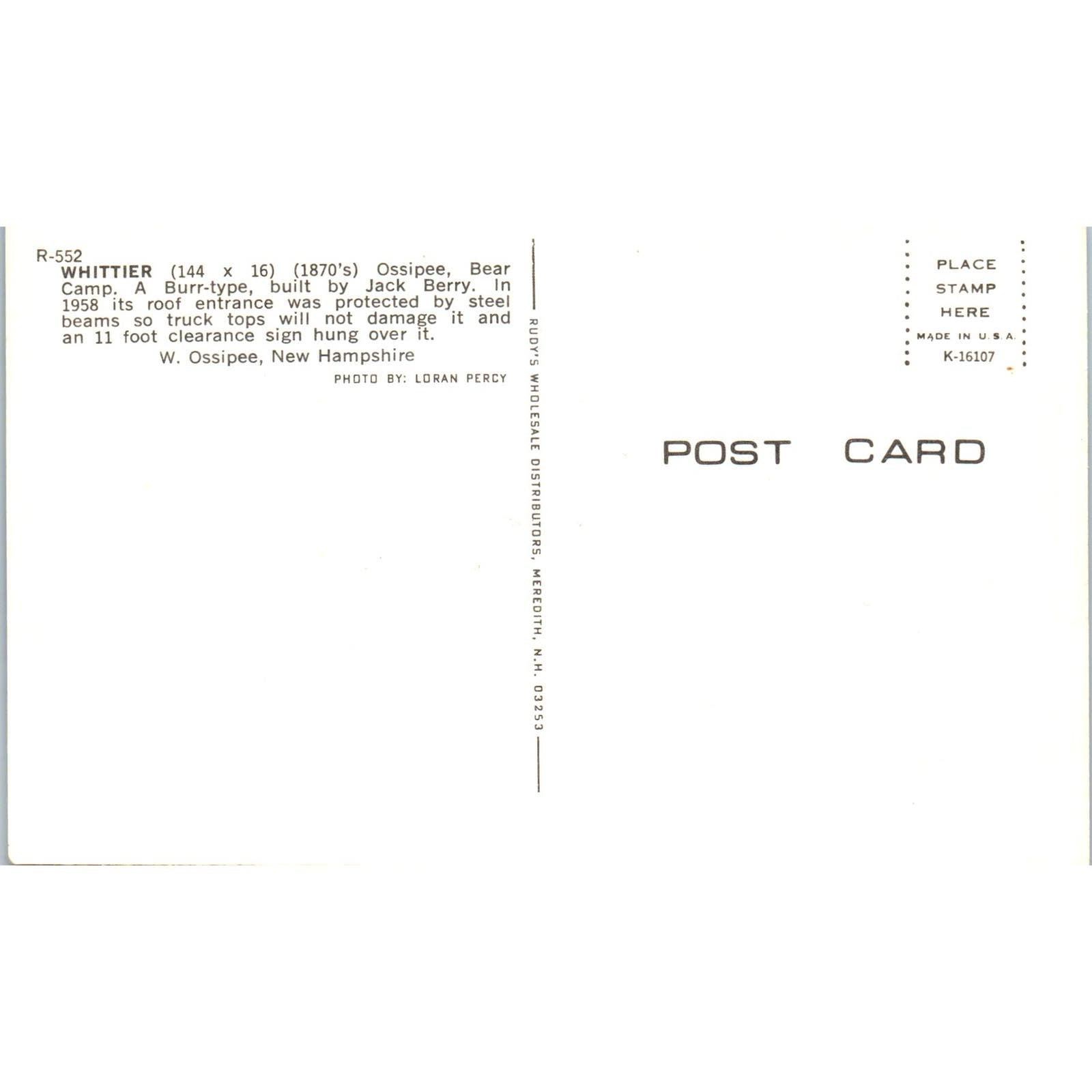 Whittier Ossipee Bear Camp New Hampshire Covered Bridge Postcard PC5