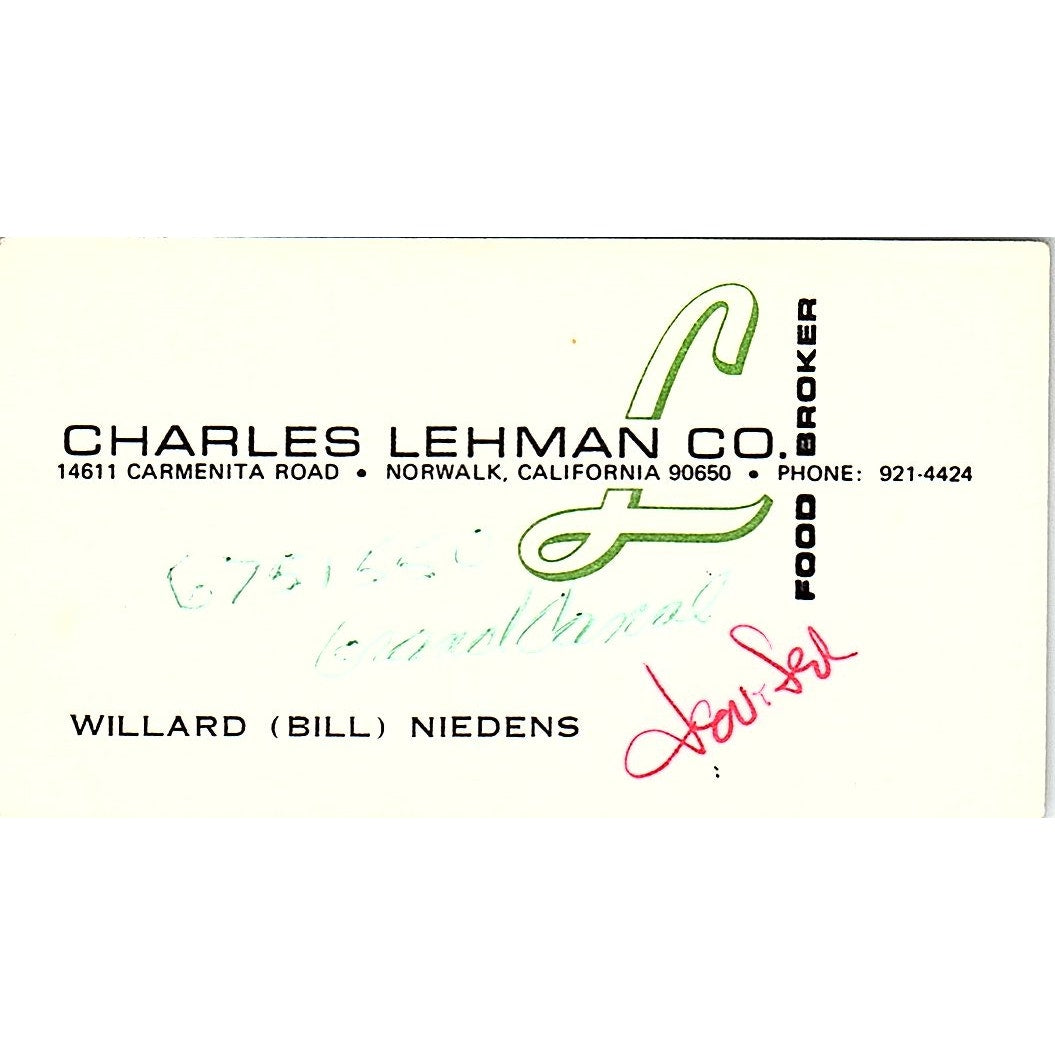 Willard Niedens Charles Lehman Co Norwalk CA Vintage Business Card SD9-B10