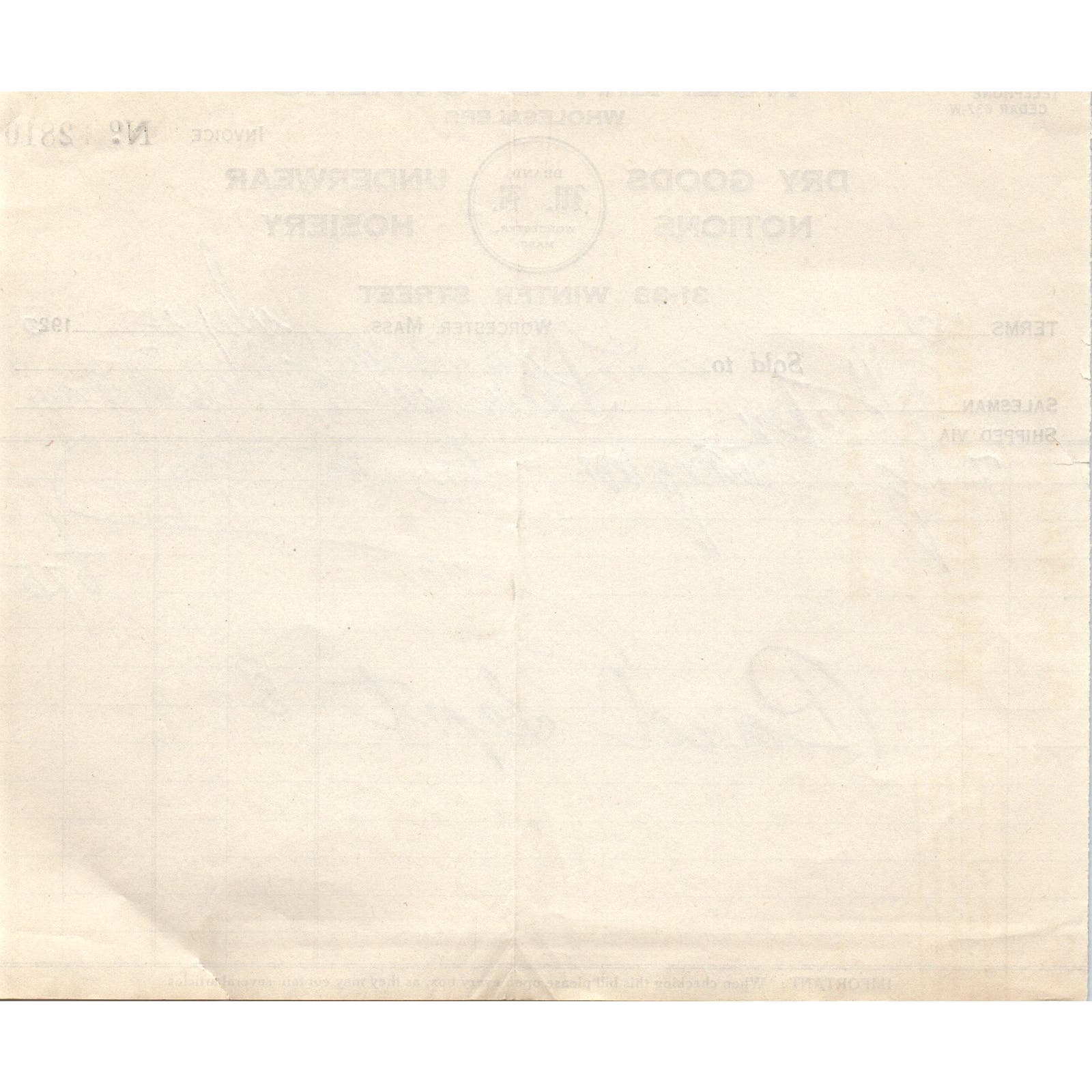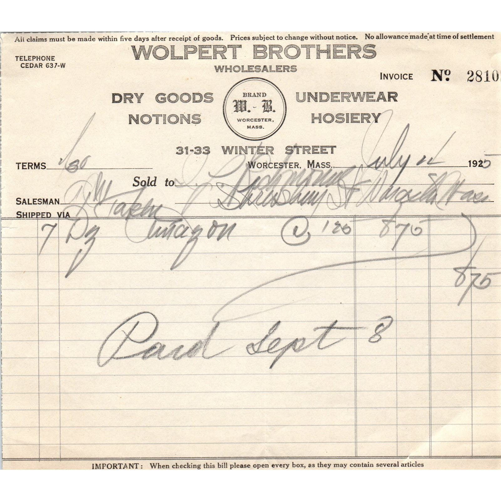 Wolpert Brothers Dry Goods Worcester MA 1925 Original Billhead Receipt D8-LL