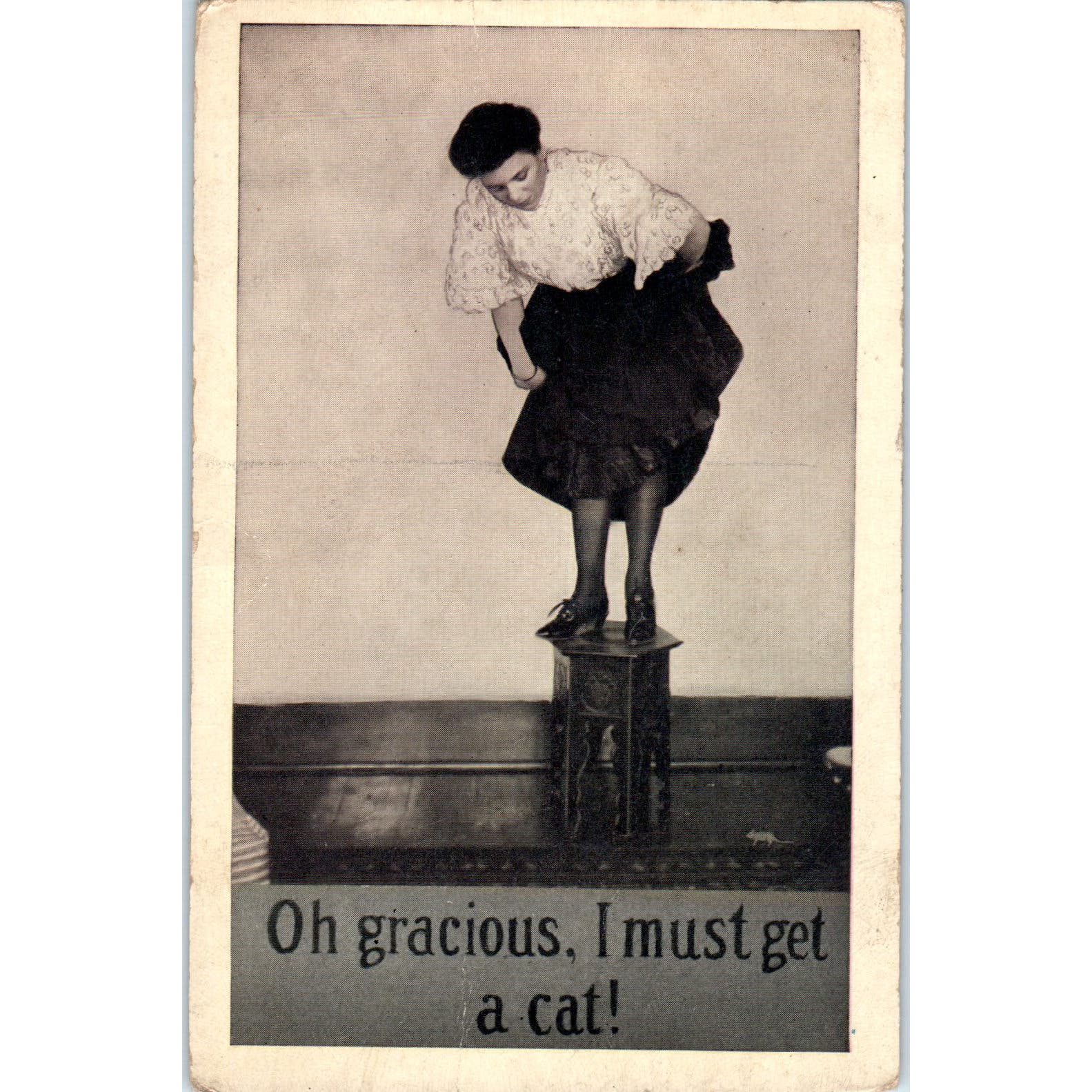 Woman Scared of Mouse "I Must Get a Cat" Humor c1910 Original Postcard PB1
