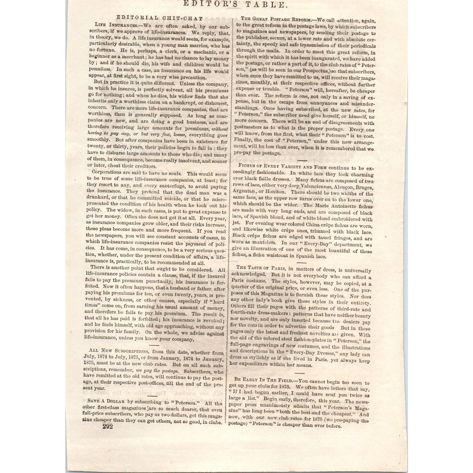This measures roughly 5x8. Pulled from a 1878 Issue of Peterson's Magazine. See pics for condition. Measurements are approximate.