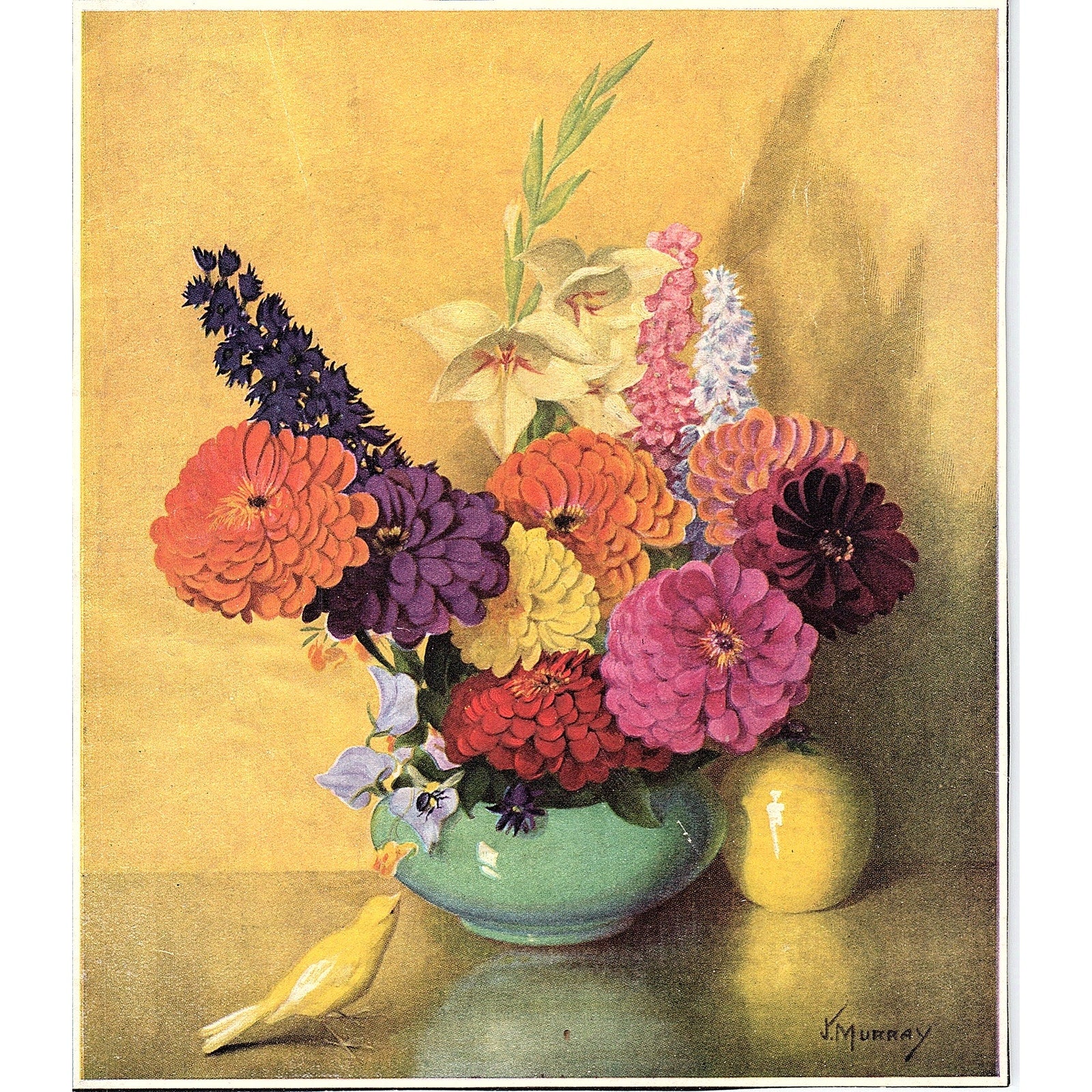 Zinnia Bouquet Still Life K. Murray Floral Art Print 7x8.5 V6